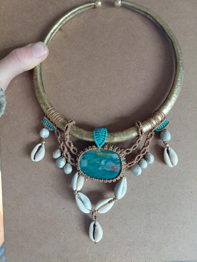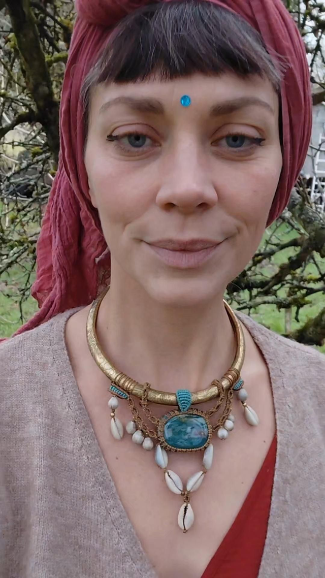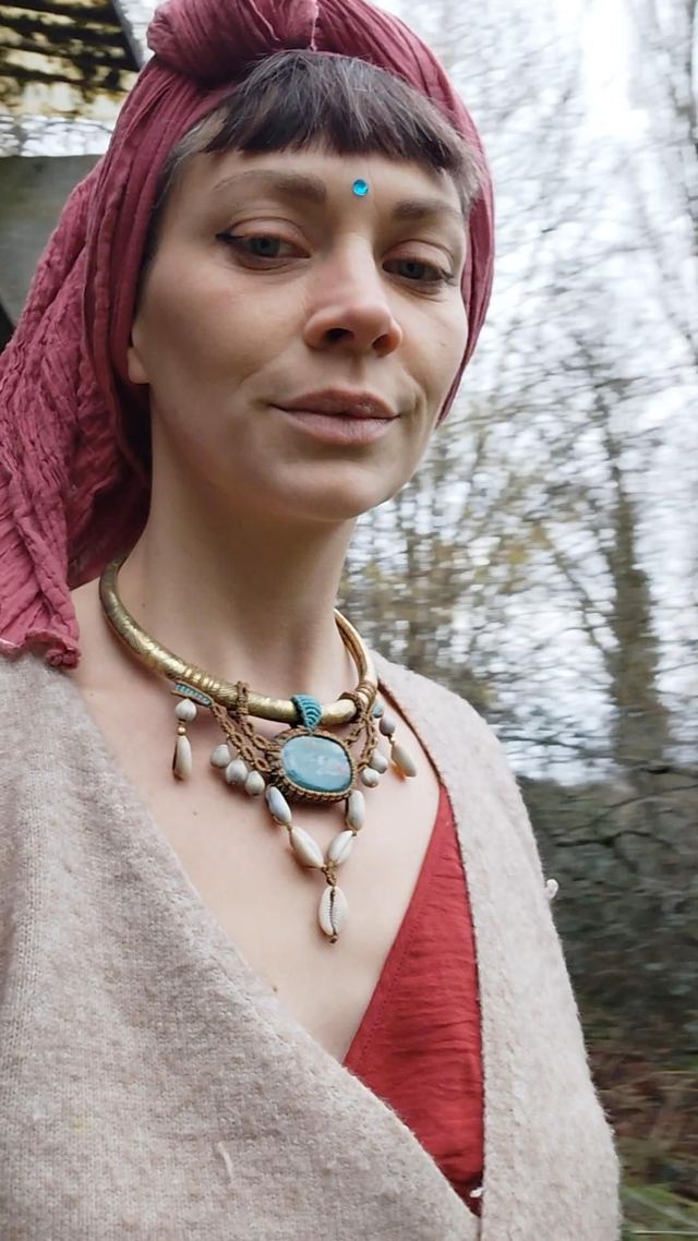 Ce collier me fait penser à un collier de cérémonie. Il vous invite à être dans le moment le moment, et à calmer le mental.